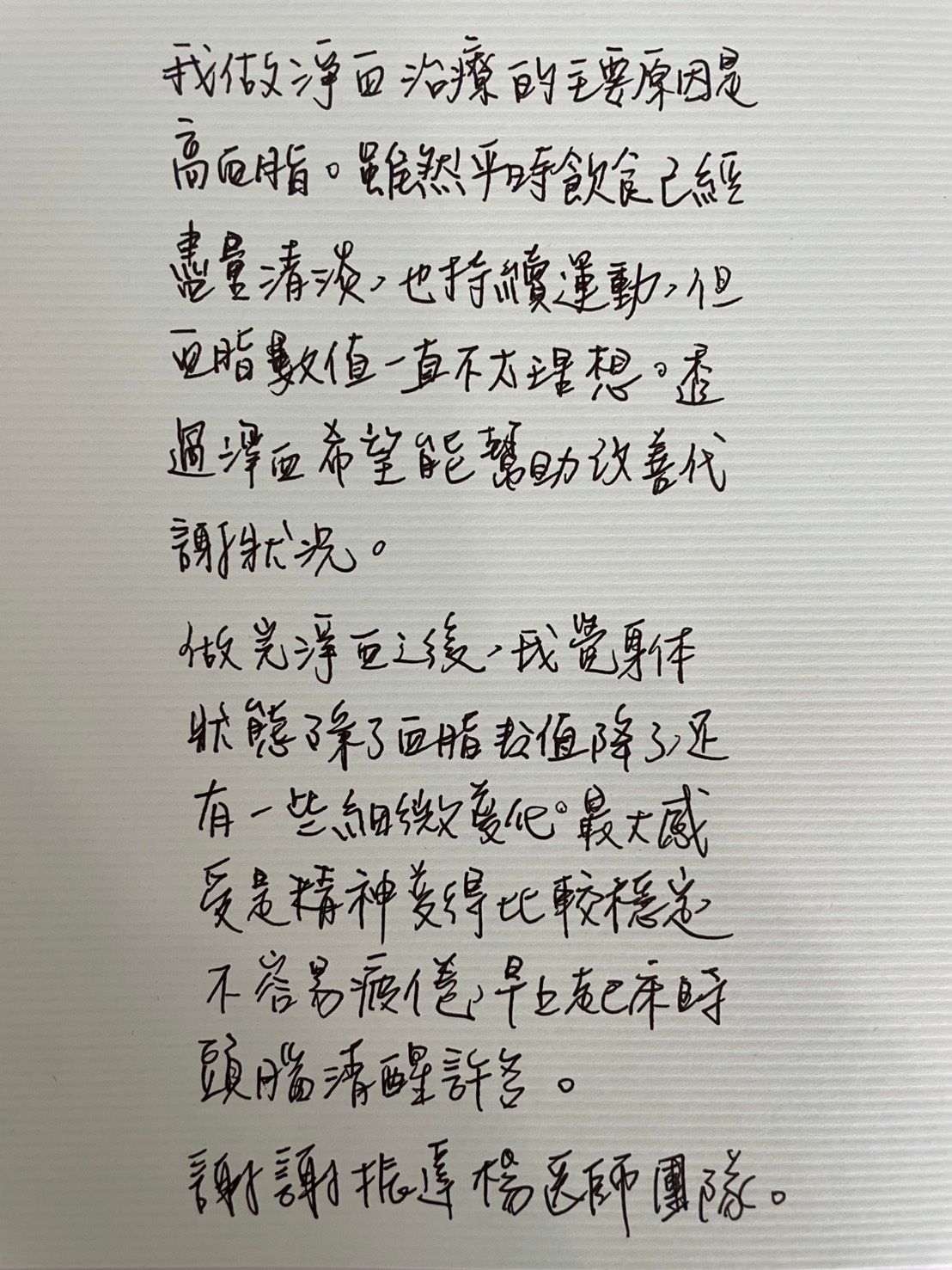 陳先生是聰穎配合度很高的患者,建議清淡的飲食、忌高糖高血脂的食物,練習呼吸法學會放鬆,規律的生活作息避免熬夜,有助於提升免疫,持續的運動身體健康才會長長久久。